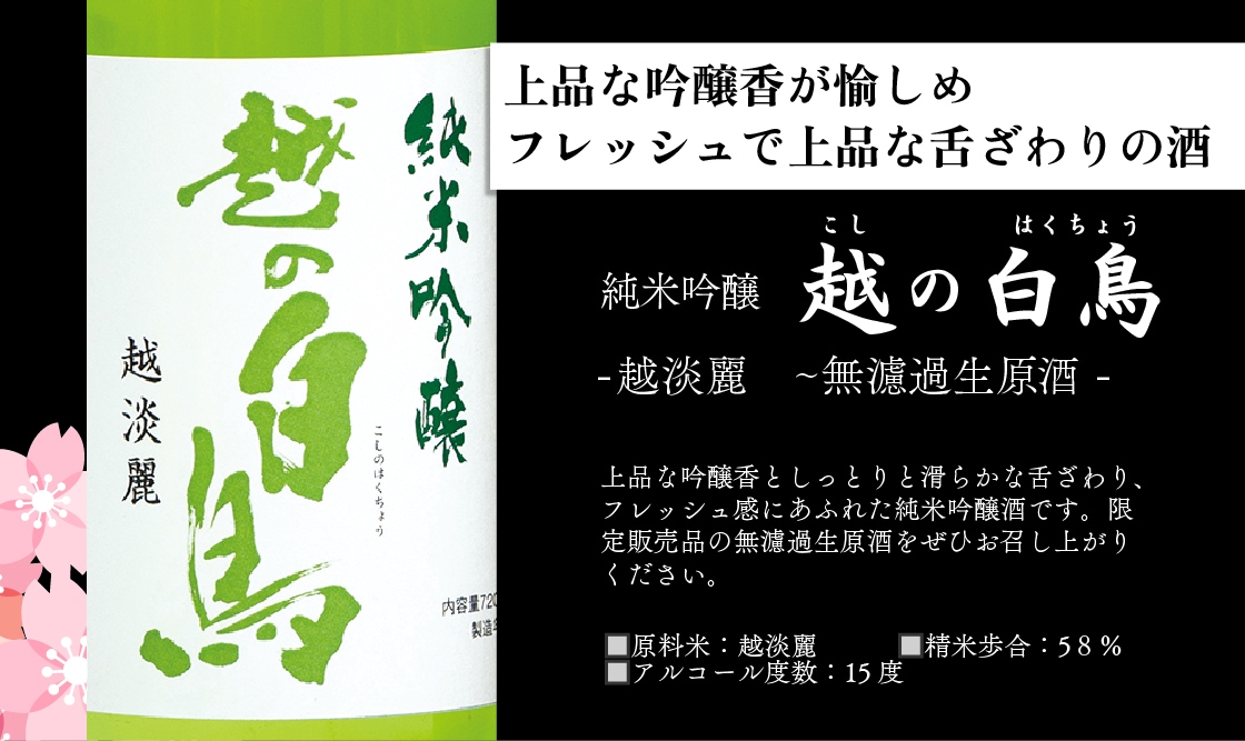 今年はフレッシュ感が愉しめる越の白鳥の「無濾過生原酒」2本セットです。